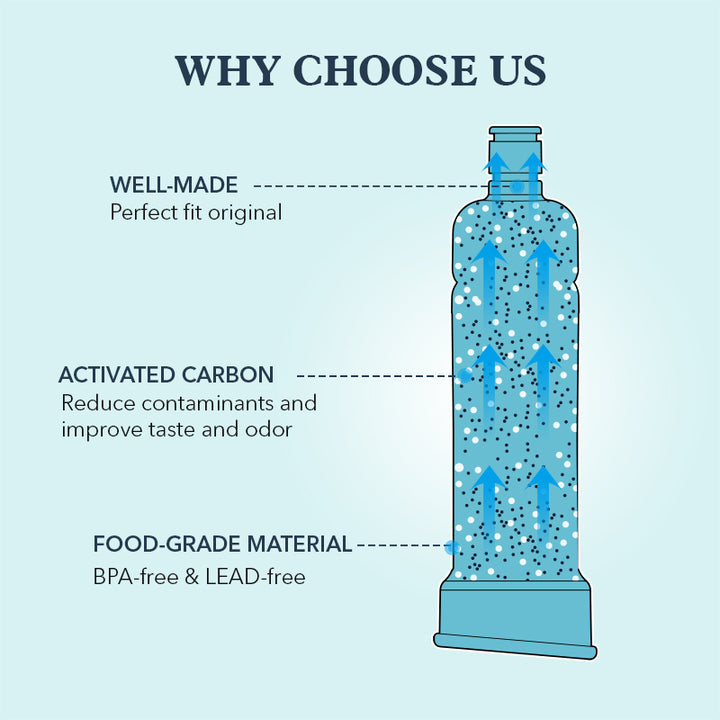 BPA-Free and food-grade materials, Sri Lankan coconut shell carbon block, super adsorption capacity, maximum reduction of harmful impurities contained in drinking water, while retaining beneficial minerals to the human body, significantly improved the taste of water.