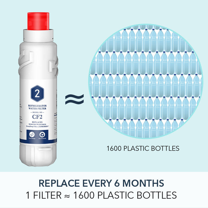 This refrigerator water filter 1 could reduce 24 impurities in water as well as other harmful contaminants. The fridge filter is compatible with Everydrop Water Filter 2, W10413645A EDR2RXD1 Water Filter and 9082 Water Filter. We recommend to replace the filter every 6 months to ensure the filtration performance.